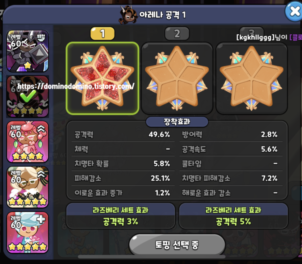 흑당 (다름) | 5 라즈베리 | 피감 강조 | 5 아몬드 | 피감 46 / 공속 9.3 | 5 라즈베리 (메인 딜러) |